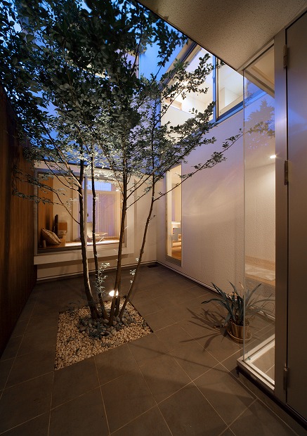 家の中央に、約4.5帖の中庭をつくりました。玄関からもリビングからもキッチンからも、2階からもエゴの木の優しい葉のゆらぎが感じられます。